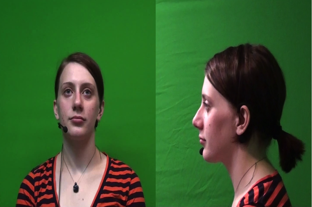The audio is recorded with a close-talk microphone at 48 kHz; the video is collected with two high definition cameras which provide 1440 x 1080 resolution at 29.97 fps. One camera captures frontal view of the subjects including shoulder and head. The second camera captures profile view of the subjects
